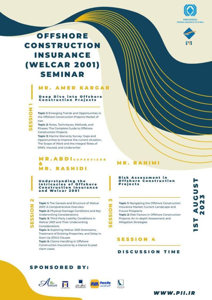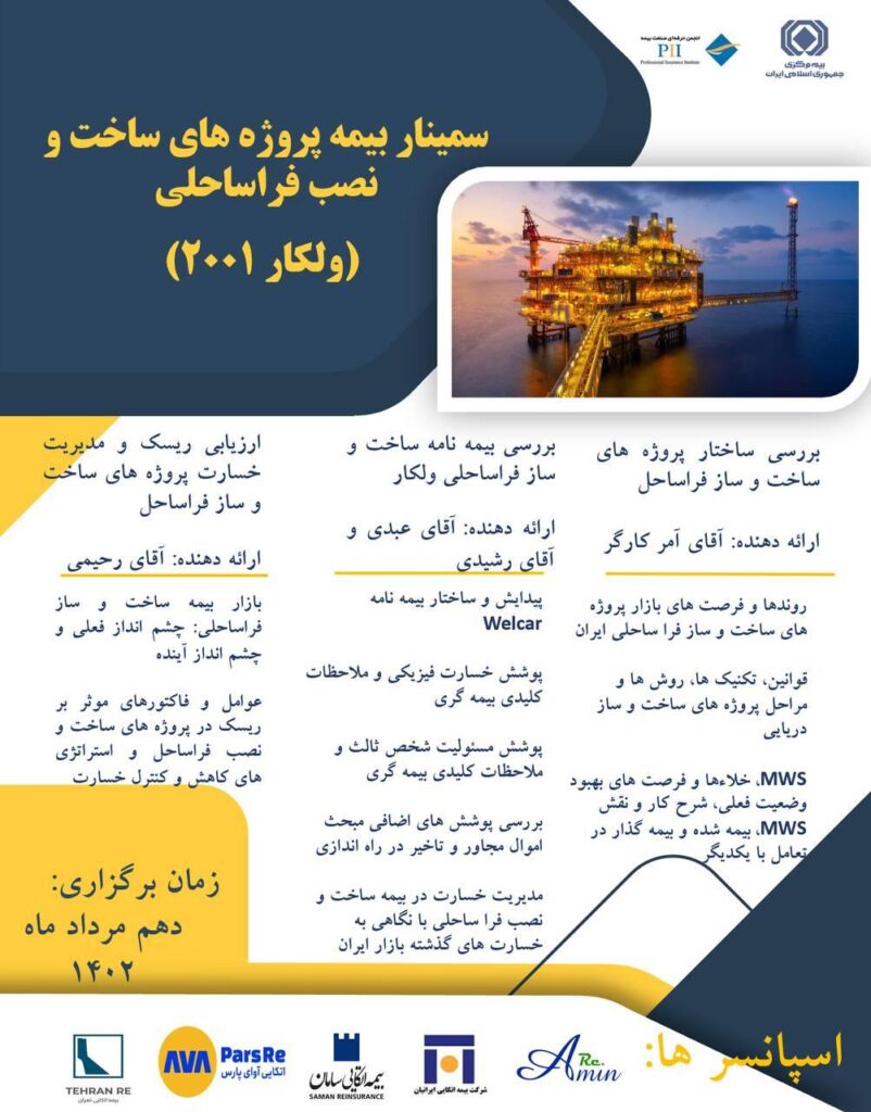 سمینار بیمه پروژه های ساخت و نصب فراساحالی (ولکار 2001) با همکاری انجمن حرفه ای صنعت بیمه و بیمه مرکزی و همچنین با همت شرکتهای بیمه اتکائی در دهم مردادماه 1402 در ساختمان قدیم بیمه مرکزی برگزار می شود.