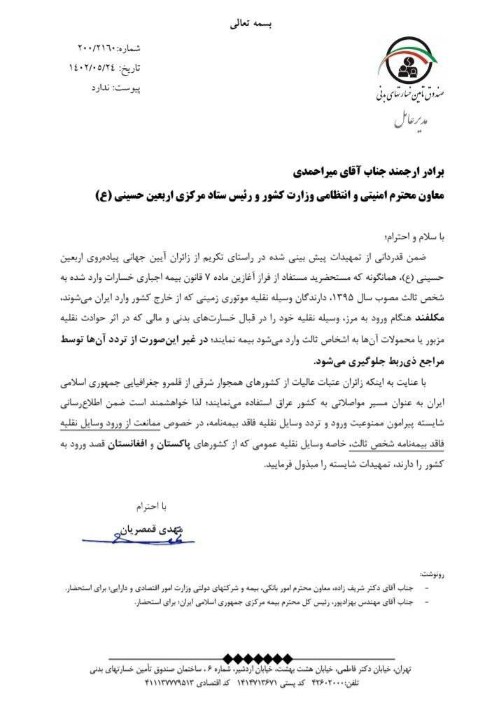 مهدی قمصریان، مدیر عامل صندوق تامین خسارتهای بدنی در نامهای به معاون امنیتی و انتظامی وزرات کشور با اشاره به ماده 7 قانون بیمه اجباری شخص ثالث بر موضوع اجباری بودن بیمه برای وسایل نقلیه در زمان ورود به مرزهای کشور تاکید کرد و ممنوعیت تردد وسایل نقلیه بدون بیمه را خواستار شد.