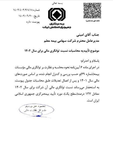 در اجرای ماده ۶ آیین نامه نحوه محاسبه توانگری مالی مؤسسات بیمه و براساس صورتهای مالی ۱۴۰۱، شرکت بیمه معلم برای سومین سال پیاپی، در سطح یک توانگری مالی قرار گرفت.