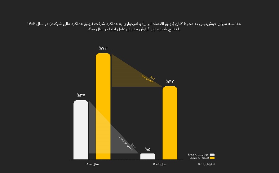 بر اساس پالایش نظرات حاصل از 500 مصاحبه مدیرعاملان در سال 1401، که دنیای اقتصاد انجام داده است، خوشبینی مدیران به محیط کسبوکار در سال مذکور نسبت به سال 1400 بیش از 30 درصد کاهش نشان میدهد (شکل 1).