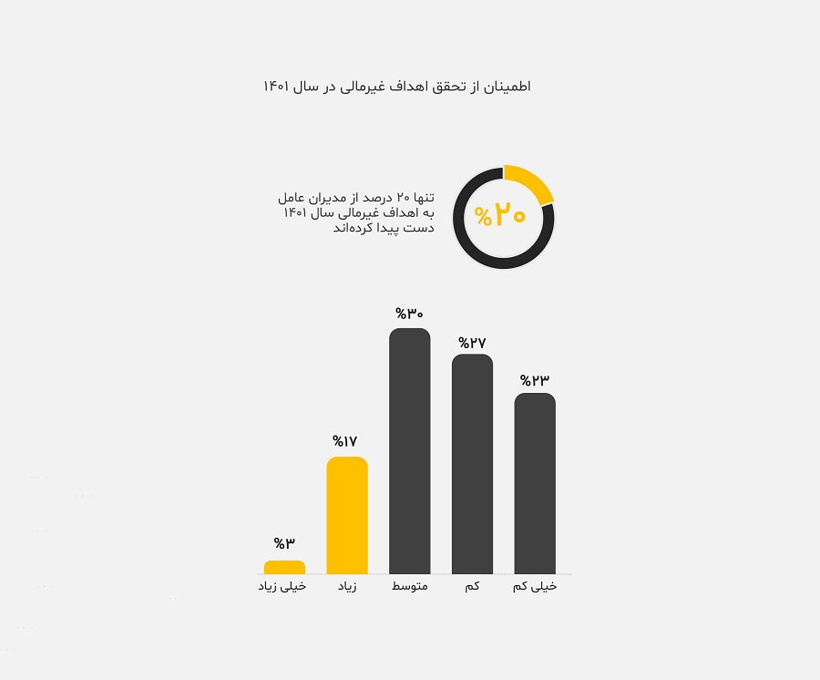 پیام شکل 3 آن است که تحقق اهداف غیراقتصادی در سال 1402 تقریباً قابل پیشبینی نیست و نااطمینانی در این گستره بیشتر است. در چنین شرایطی توجه به مسئولیتهای اجتماعی میتواند به بهبود وضعیت برای سالهای آینده کمک کند. توجه به برنامههای پایدار، میتواند در این مسیر، نااطمینانی را کاهش دهد.