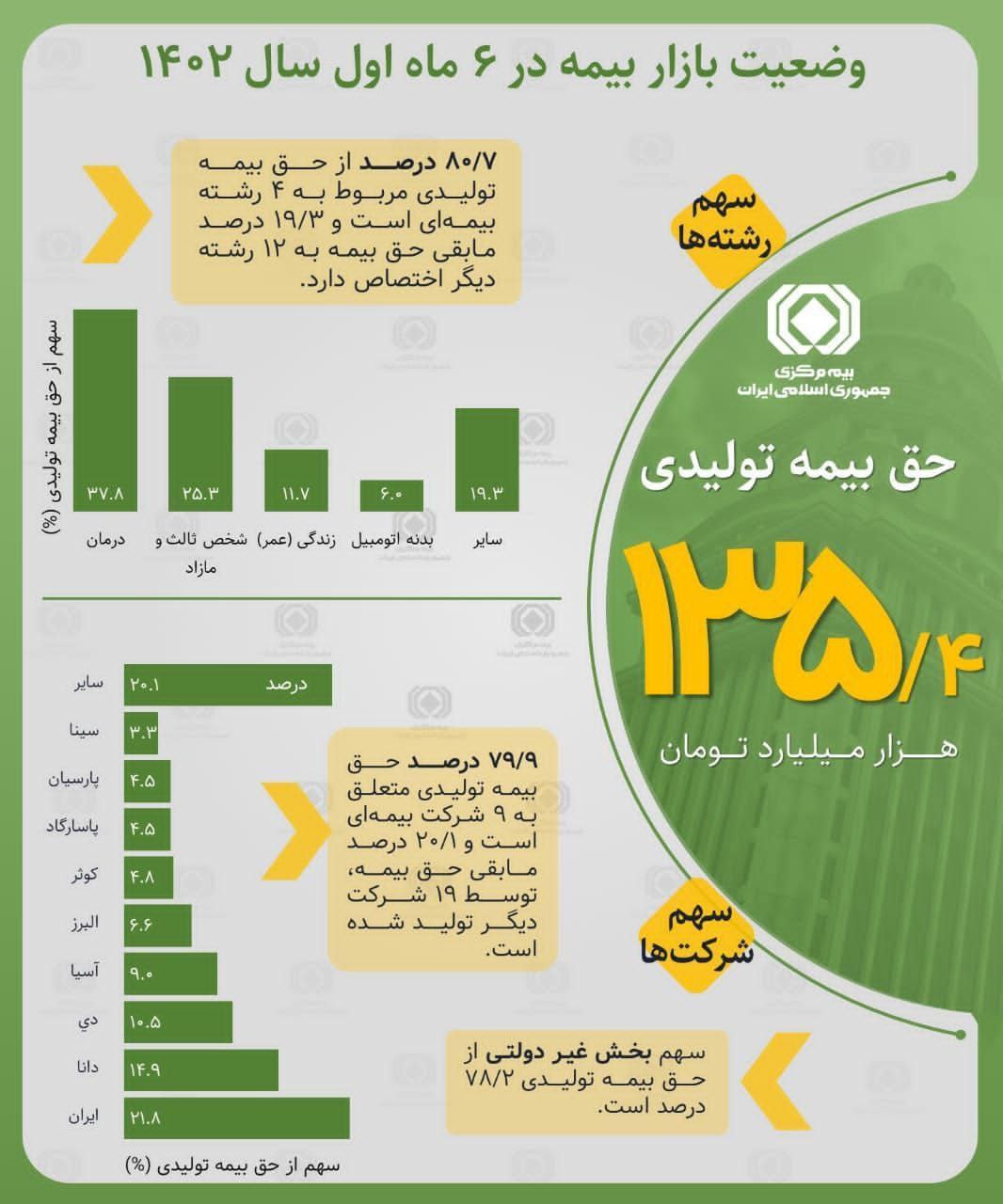 مطابق آمارهای ارائه شده از سوی نهاد ناظر صنعت بیمه شرکتهای بیمه ایران، دانا، دی، آسیا و البرز بیشترین حق بیمه تولیدی را تا نیمه اول سال جاری داشتهاند.