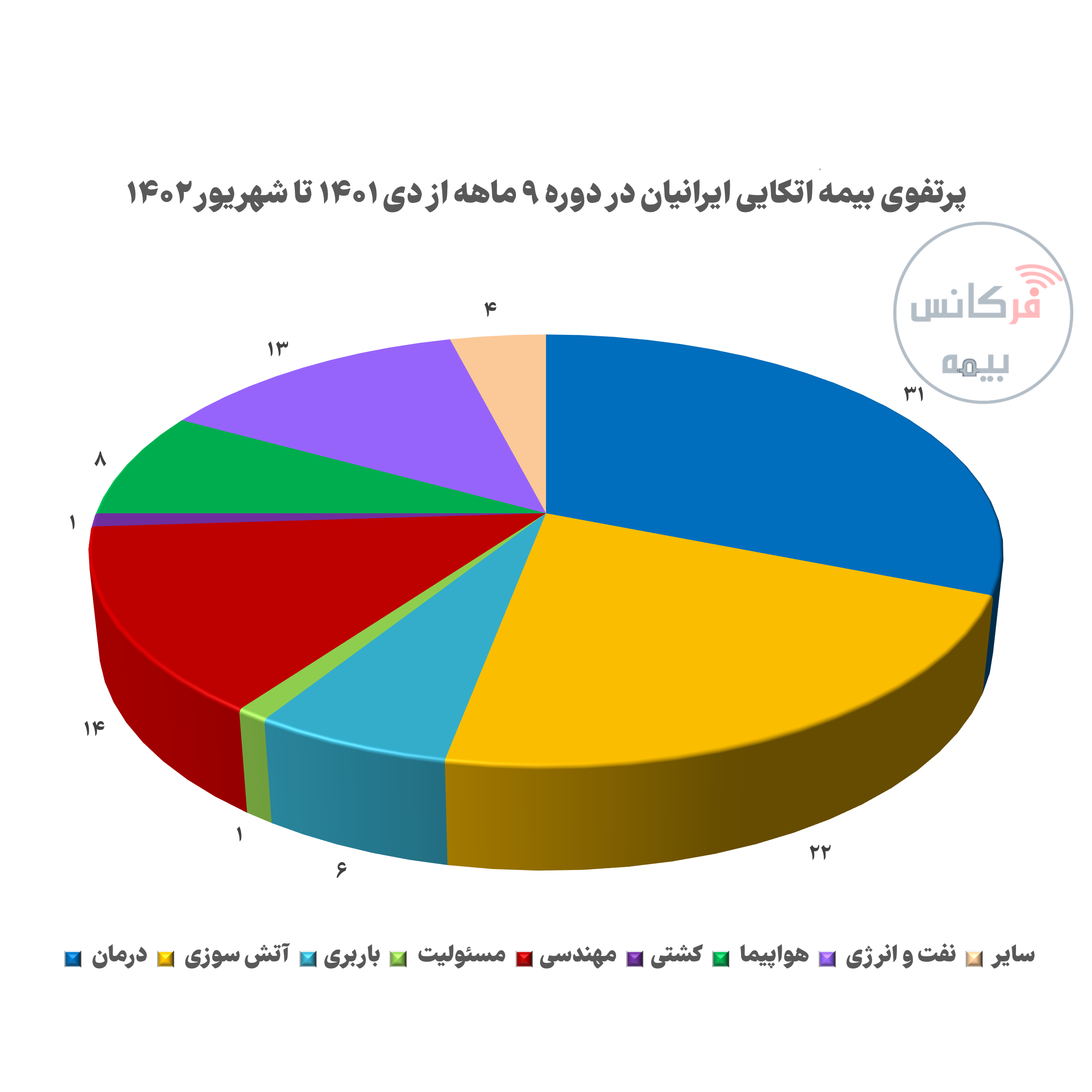 بیمه اتکایی ایرانیان از ابتدای سال مالی خود در دی ماه ۱۴۰۱ معادل ۳۱ درصد پرتفوی خود را به رشته بیمه درمان اختصاص داده است. به دنبال آن رشته آتشسوزی با ۲۲ درصد، رشته مهندسی با ۱۴ درصد و رشته نفت و انرژی با ۱۳ درصد بیشترین سهم را از پرتفوی بیمه اتکایی ایرانیان در سال مالی ۱۴۰۲ به خود اختصاص دادهاند.