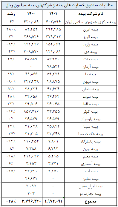 در سال 1400 در بین شرکتهای بیمه ای بیشترین بدهی را به ترتیب شرکتهای بیمه رازی با 93،1 میلیارد تومان، بیمه کوثر با 85،7 میلیارد تومان و بیمه مرکزی جمهوری اسلامی با بیش از 42 میلیارد تومان به صندوق خسارات بدنه داشتند. مجموع بدهی های شرکتهای بیمه ای در سال 1400 به این صندوق بالغ بر 379،6 میلیارد تومان بود اما در سال 1401 رقم بدهی های صنعت بیمه به این صندوق با افت قابل توجه 48 درصدی نسبت به سال 1400 به 197،4 میلیارد تومان تقلیل پیدا کرد.