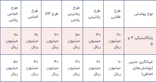 پوششهای بیمه تکمیلی انفرادی آسماری به دستههای مختلفی تقسیم میشود. براساس این تقسیمبندی پوشش هزینههای آزمایشهای ژنتیک در بخش پاراکلینیکی ۴ و ۵ قرار میگیرد که شامل هزینههای پاتولوژی و ژنتیک پزشکی، تستهای آلرژیک، فیزیوتراپی گفتار درمانی و کاردرمانی میشود. در جدول زیر سقف تعهدات پوشش بیمه تکمیلی برای پوشش هزینههای آزمایش ژنتیک در هر طرح آورده شده است: