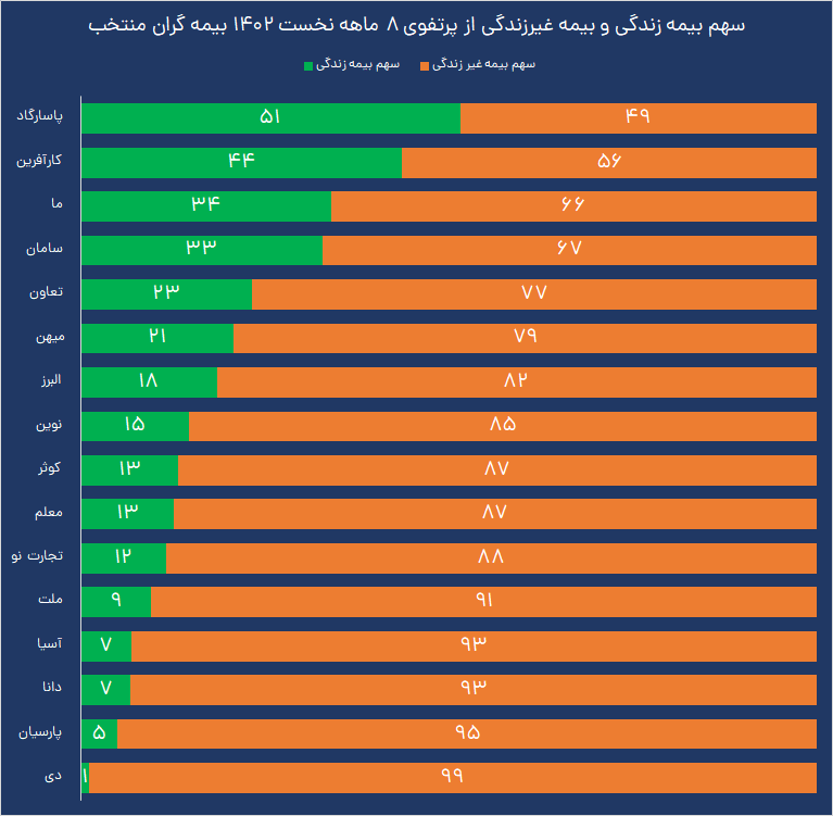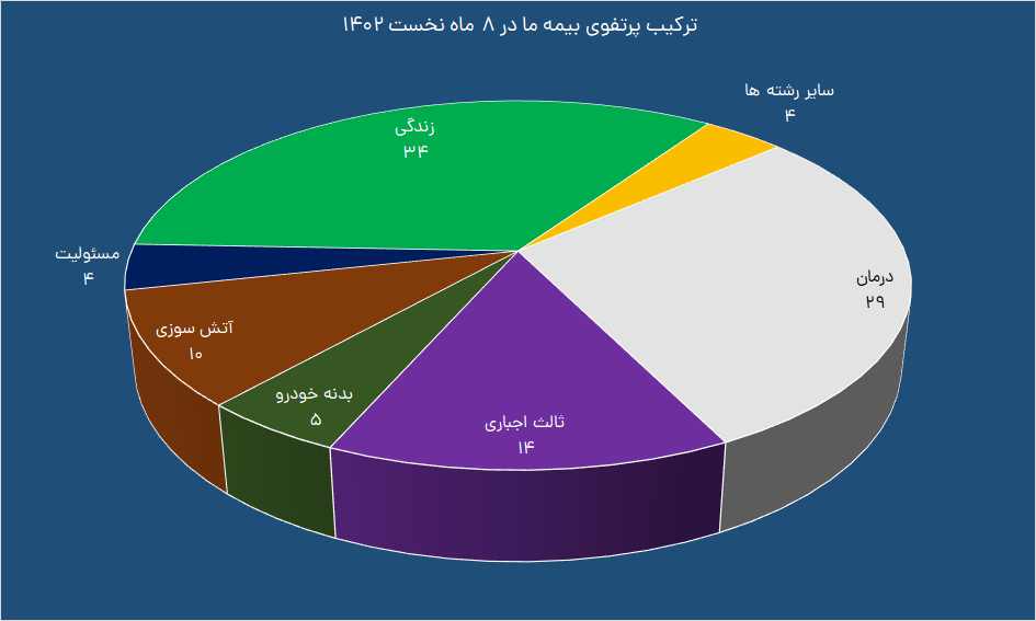 در ۸ ماهه نخست امسال، سهم رشته درمان از درآمد حق بیمه های صادره بیمه ما ؛ ۲۹ درصد ، سهم بیمه های زندگی؛ ۳۴ درصد ، سهم بیمه شخص ثالث و حوادث سرنشین؛ ۱۴ درصد ، بیمه آتش سوزی؛ ۱۰ درصد ، بیمه بدنه خودرو؛ ۵ درصد ، بیمه مسئولیت؛ ۴ درصد بوده است. ۴ درصد هم متعلق به سهم سایر رشته ها است. به واقع الگوی انتخاب شده بیمه ما باعث شده تا این شرکت بالاترین سهم از فروش را به بیمه های زندگی اختصاص دهد و نکته مهمتر اینکه ۹۱٫۳ درصد از حق بیمه تولید شده رشته زندگی ، به میزان ۱۴ هزار و ۲۰۰ میلیارد ریال به بیمه زندگی اندوخته دار اختصاص پیدا کرده است.