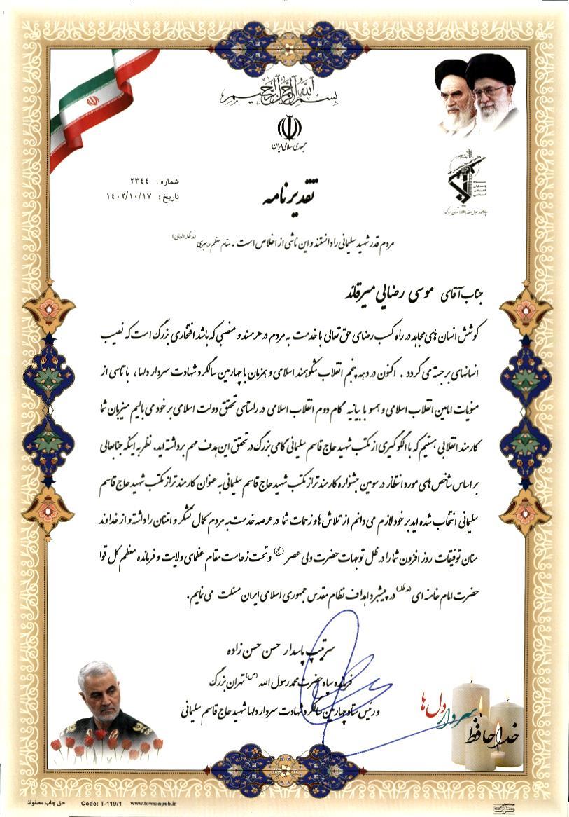 فرمانده سپاه حضرت محمدرسول الله (ص) تهران بزرگ در سومین جشنواره کارمند تراز مکتب شهید حاج قاسم سلیمانی و براساس شاخص های تعریف شده و در راستای تحقق اهداف دولت اسلامی از موسی رضایی میرقائد تقدیر نمود.