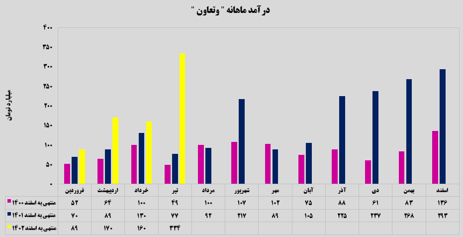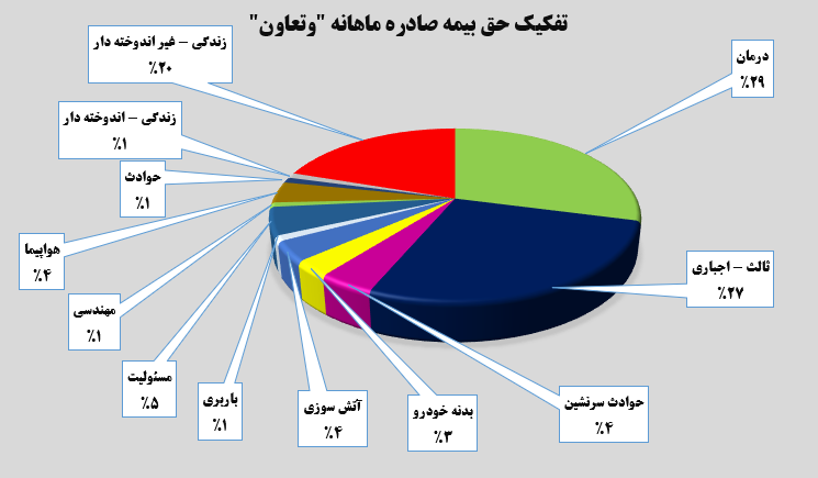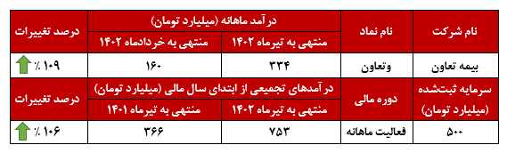 “وتعاون” بیشترین درآمدزایی که از فروش حق بیمه در تیرماه داشت متعلق به رشته بیمه «درمان» بود که از این بخش توانست ۹۷ میلیارد تومان درآمدزایی داشته باشد، این رشته بیمه در این دوره ۲۹ درصد از درآمد ماهانه را به خود اختصاص داد. دیگر رشته بیمه درآمدزای “وتعاون” در این دوره در بخش «ثالث – اجباری» با مبلغ ۹۱ میلیارد تومان اعلام شد که ۲۷ درصد از درآمد ماهانه را تشکیل میدهد.