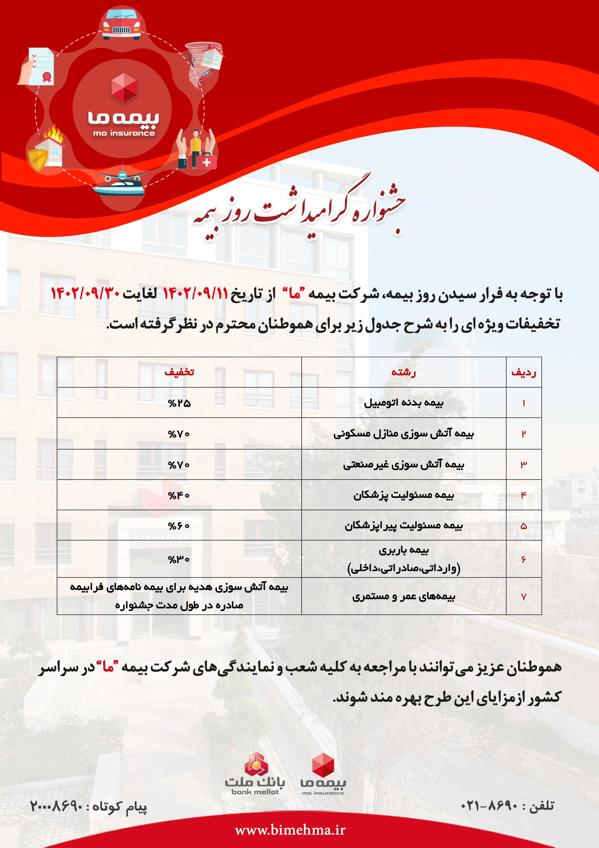با توجه به فرا رسیدن روز بیمه، شرکت بیمه ما ار تاریخ 1402/9/11لغایت 1402/9/30تخفیفات ویژه ای را برای هموطنان در نظر گرفته است