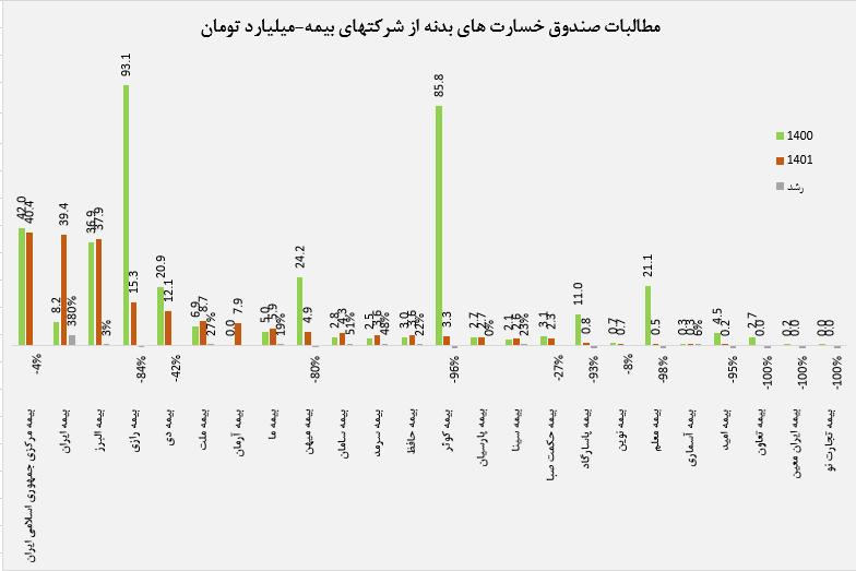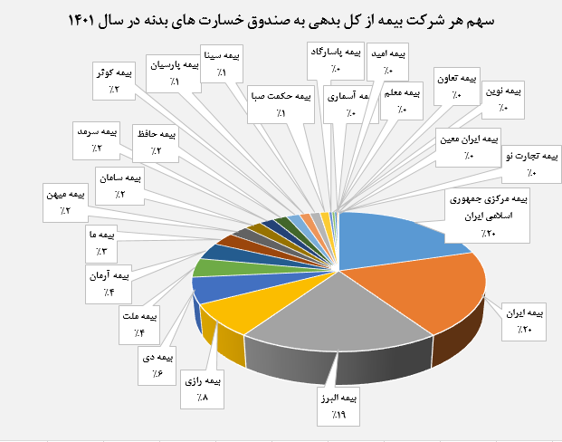 در این بین شرکتهای بیمه تعاون، بیمه ایران معین و بیمه تجارت نو در سال 1400 بدهی خود را به صندوق خسارت های بدنه به صفر رساندند. شرکتهای بیمه معلم، بیمه کوثر، بیمه امید، بیمه پاسارگاد، بیمه رازی، بیمه میهن، بیمه دی، بیمه حکمت صبا، بیمه نوین و بیمه مرکزی جمهوری اسلامی نیز موفق به کاهش بدهی های خود شدند. حجم بدهی های بیمه پارسیان در سال 1401 بدون تغییر نسبت به سال 1400 در محدوده 2،6 میلیارد تومان باقی ماند.