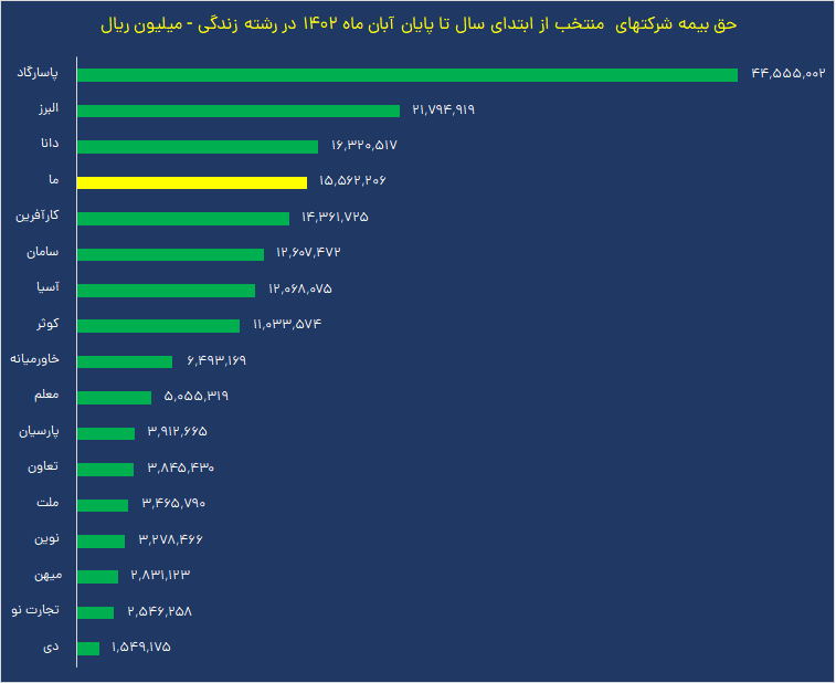 این تغییر باعث شده تا بیمه ما در بین شرکت های بیمه منتخب پس از شرکت های بیمه پاسارگاد، البرز و دانا در رتبه چهارم از حیث مجموع حق بیمه تولیدی رشته بیمه زندگی و بالاتر از شرکت هایی چون کارآفرین، سامان ، آسیا، کوثر، معلم و پارسیان قرار گیرد.